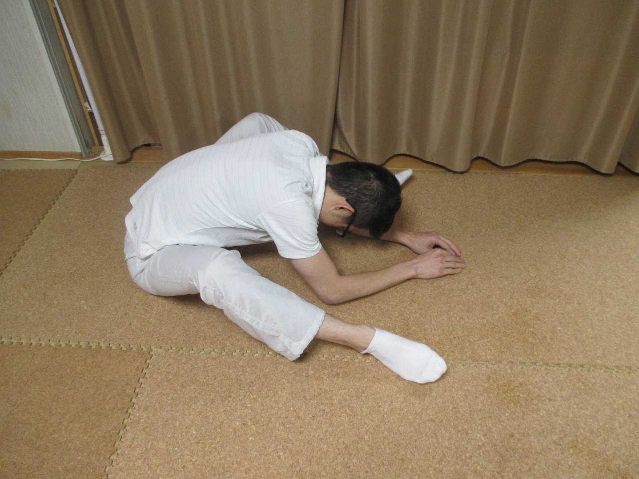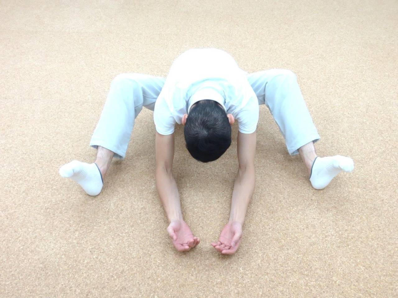 この後、「膝を伸ばして脚をとじた上体の前曲げ」をやるとよくまがるようになっています